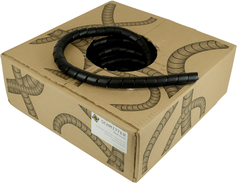 Scheuerschutzwendel im Abrollkarton, Werkstoff HDPE (Polyethylen hoher Dichte), geeignet für den Einsatz an Geräten und Anlagen im Temperaturbereich -40 bis 138°C, UV-beständig.